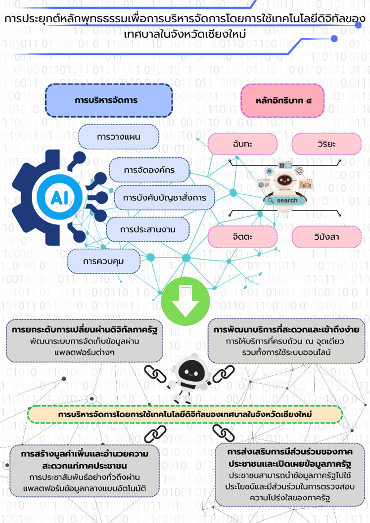 This research article had the following objectives: 1. To study the management using digital technology of municipalities in Chiang Mai Province. 2. To study the factors affecting the management using digital technology of municipalities in Chiang Mai Province. 3. To present the application of Buddhist principles for the management using digital technology of municipalities in Chiang Mai Province. The research was conducted using mixed methods. The quantitative research collected data from a sample group of 220 people using a questionnaire with an overall reliability value of 0.929. The qualitative research was conducted through in-depth interviews with 18 key informants. Then, the synthesized data from the research results were brought into a focus group discussion with 10 participants to confirm the study results.