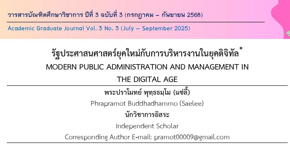 This academic article is a study of “Modern Public Administration and Management in the Digital Age”. Currently, the transition to the digital age has made public administration adapt to the current state of technology to provide fast and efficient public services. The use of digital technology in public administration, such as big data, artificial intelligence, and blockchain, helps the public sector plan and manage resources effectively. However, there are also challenges, such as data security and personnel skills development. Digital administration requires rapid adaptation and the use of digital technology to increase efficiency in public services. Modern public administration must therefore develop policies and processes that are consistent with digital transformation. In addition to increasing work efficiency, it also creates transparency and tangible public participation in public administration. In the future, public administration will continue to rely on cooperation between the public and private sectors, as well as effective planning to create confidence and transparency in the administration system that sustainably responds to the needs of society.