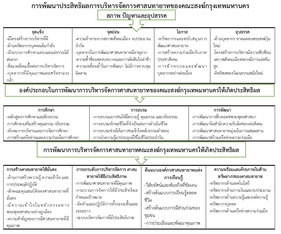 The results of the research were found: 1. Current conditions, problems, and obstacles: The Bangkok Sangha had a strong organizational structure with numerous monasteries and educational centers, sufficient resources and supportive capacity. It was also able to utilize modern technology in disseminating Buddhism. However, six major problems were identified: the declining number of religious successors, educational challenges, insufficient budget, issues in quality and behavior of some religious successors, limited reach of dissemination and internal administrative constraints. 2.Components of effective management development; effective development of religious successors emphasized three main aspects; 1.Education integrating Buddhist knowledge with modern sciences, 2.Training cultivating morality, ethics, and leadership and 3).Development strengthening faith, life skills and the use of technology for Dhamma dissemination 3.Processes of effective management development. Four processes were identified, 1. Building religious successors with stability in Buddhism 2. Enhancing management processes to be more effective 3. Establishing religious successors organizations as learning models and 4. Ensuring readiness and capacity in resource development to achieve this. The Bangkok Sangha should establish a clear Master Plan implement monitoring and evaluation systems.